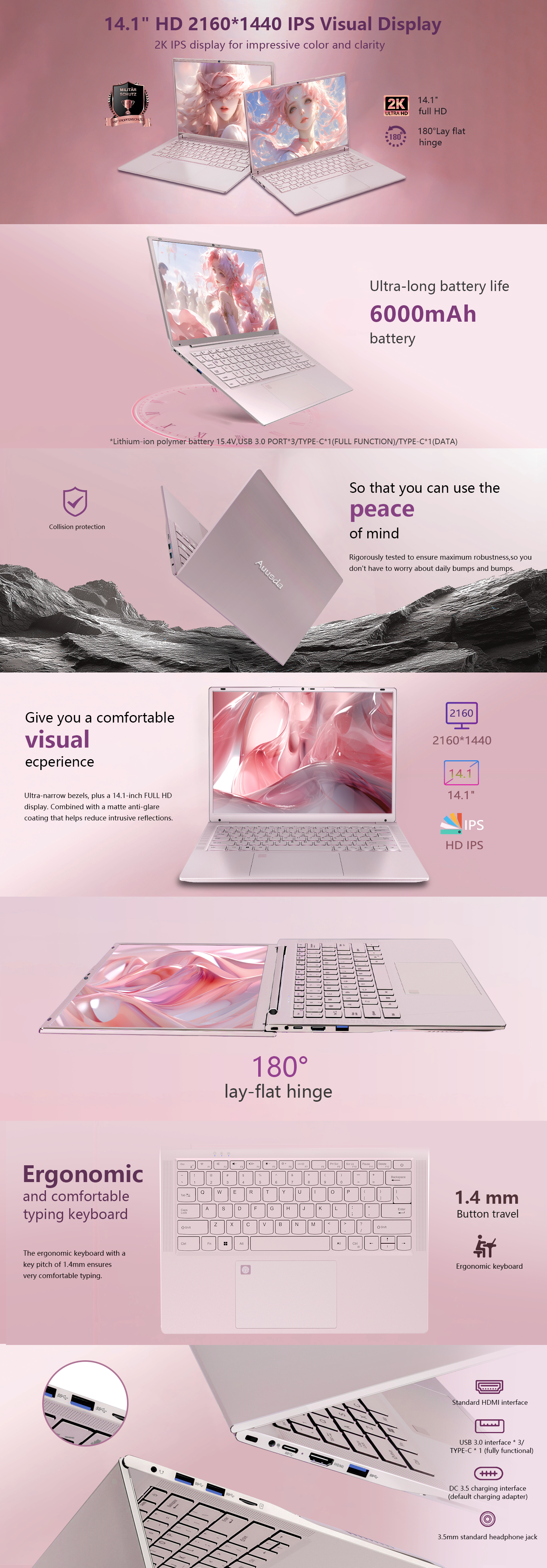 auusda 14.1" N5105 Processor Traditional Notebook Laptop,16GB DDR4 RAM, 512GB SSD, UHD (2160x1440 Pixels), Fingerprint Login, Backlit Keyboard, Dual Band WiFi 5, Bluetooth 5, USB 3.0, Win 11 Pro, Pink