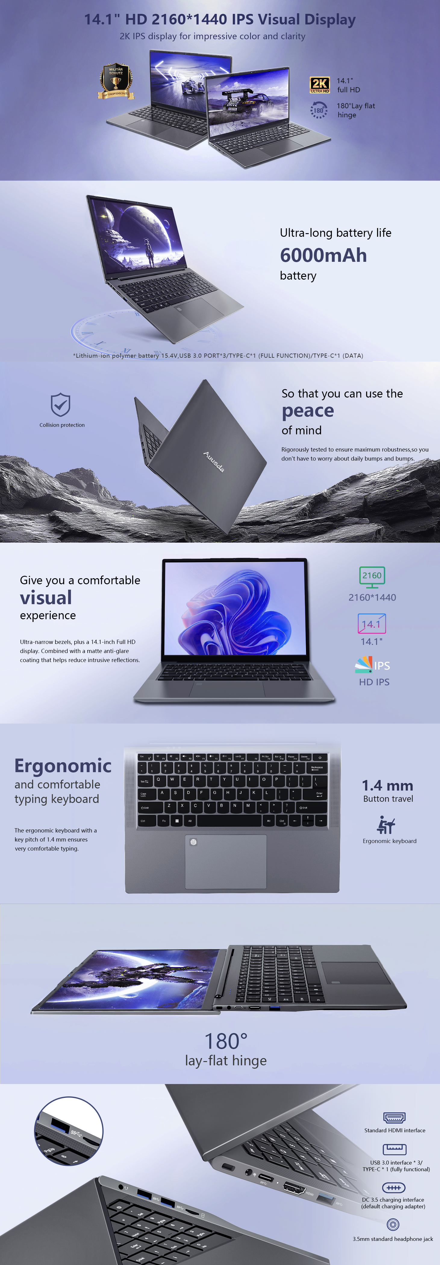 auusda14.1'' Notebook Computer Laptop IPS 2160* 1440 8GB RAM 256GB SSD N5105 Processor with WiFi 5, Bluetooth 5, USB 3.0 Interface *2/ TYPE-C*1(Full Function), Win 11 Pro, with Backlight/ Fingerprint, Grey
