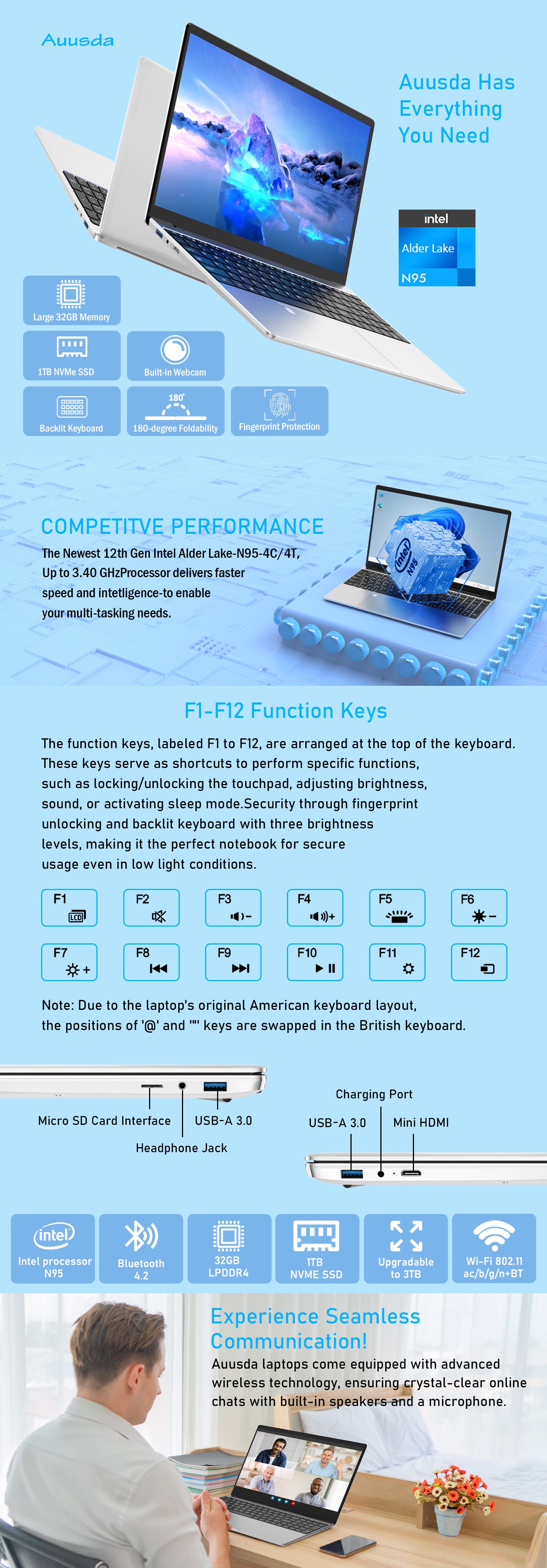 Auusda T152A Business Laptop - Intel N95 CPU,32GB RAM 1TB SSD,Silver