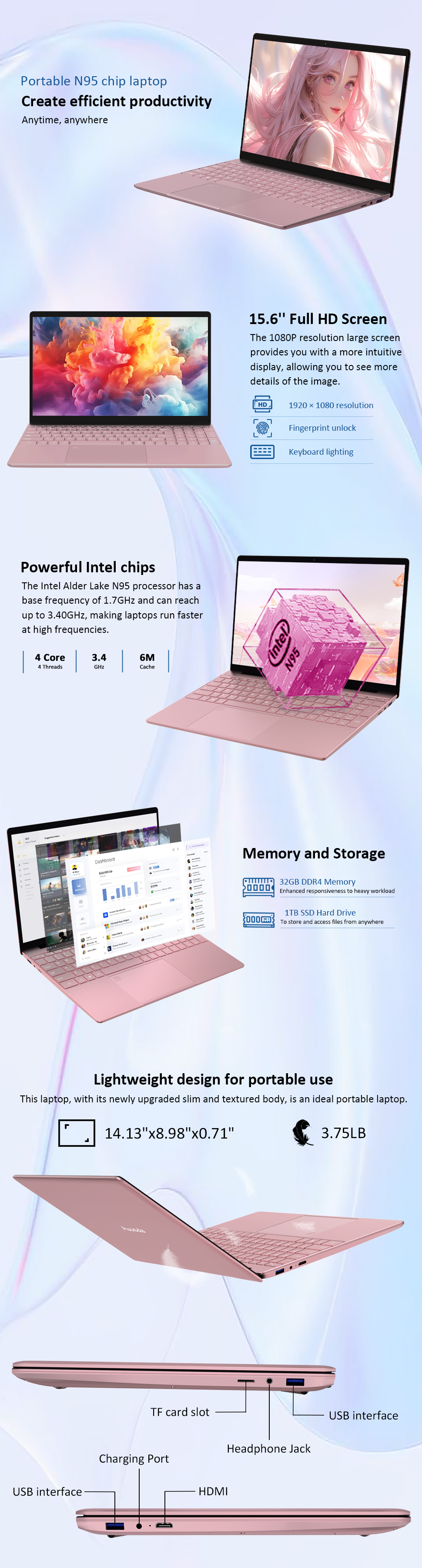 The T152A laptop combines powerful performance with a sleek, user-friendly design. Equipped with an Intel N95 processor, up to 32GB RAM, and 1TB SSD storage, it ensures smooth multitasking and ample space for all your files and media.