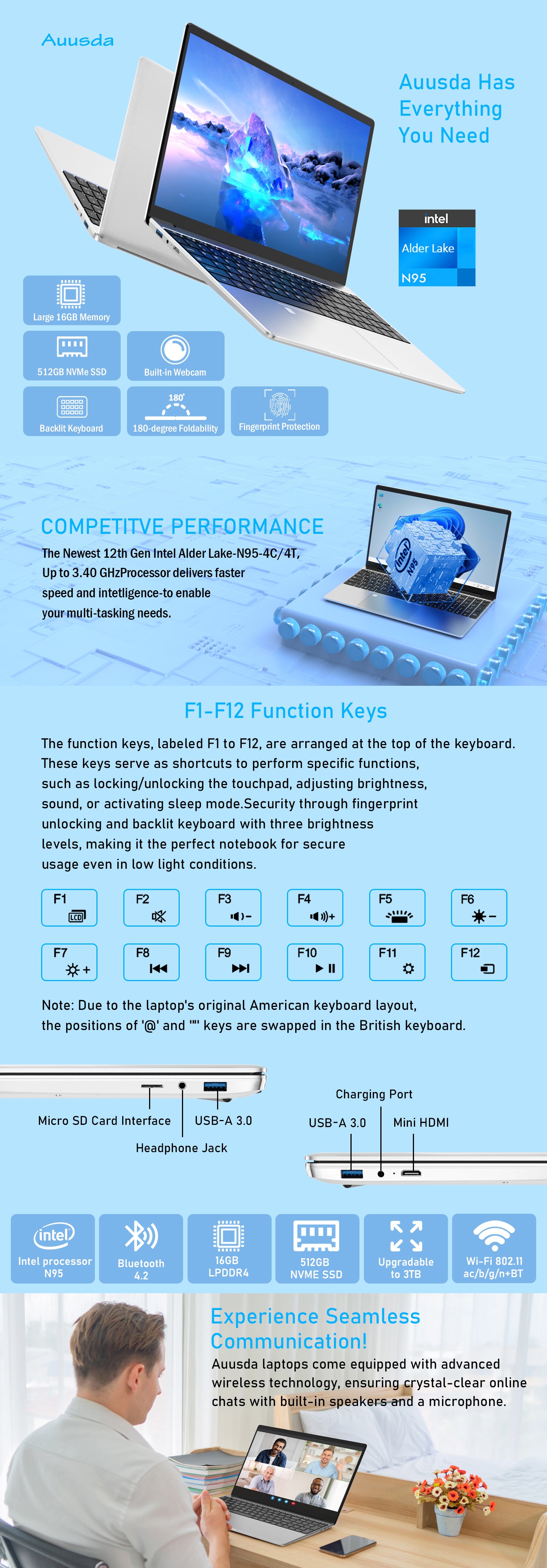 Auusda T152A Laptop-Intel N95,16GB DDR4 RAM 512GB NVMe SSD,Silver