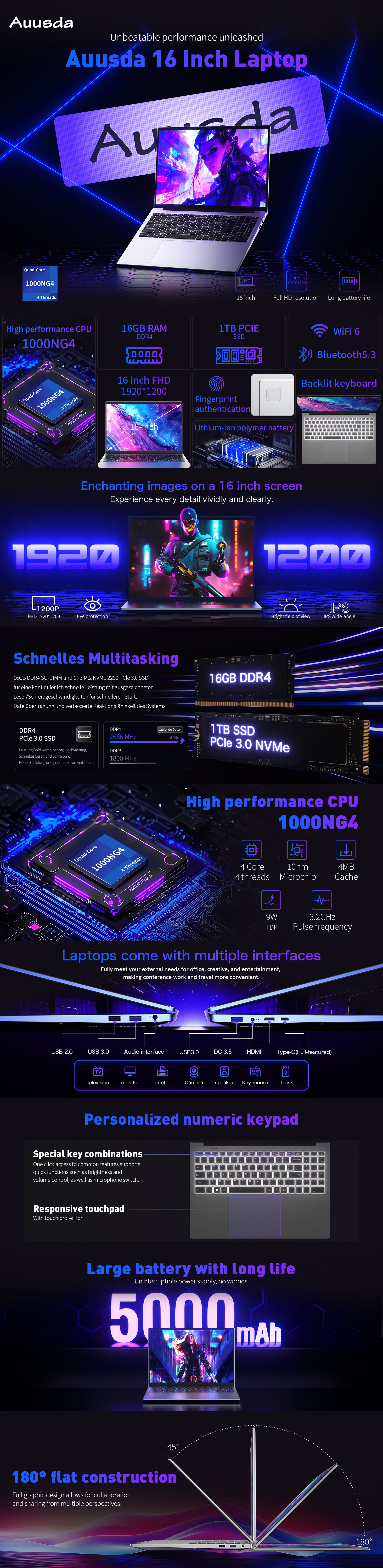 Work smarter with the 16" Full HD+ IPS Auusda T161N, featuring Intel i3-1000NG4, 16GB RAM, 1TB SSD, Wi-Fi 6, BT 5.3, fingerprint login & backlit keyboard—an ideal companion for productivity on the go.