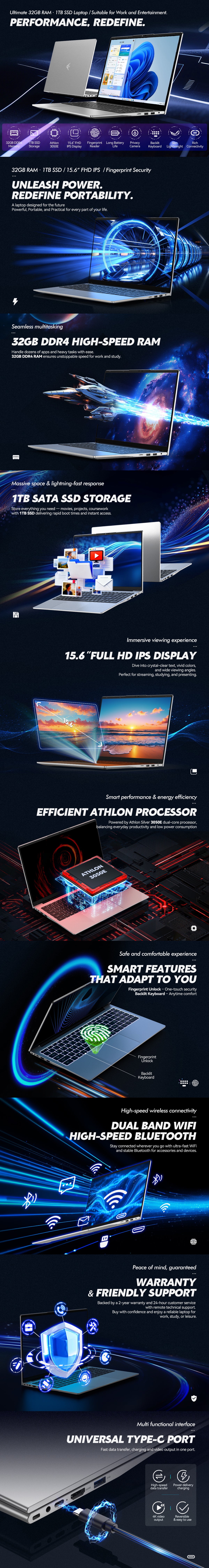 Powered by an AMD Athlon Silver 3050e and Radeon RX Vega 3, the T156A features a 15.6" Full HD IPS display, up to 32GB DDR4 RAM, and up to 1TB M.2 SSD storage. With dual-band Wi-Fi, Bluetooth 5.0, and versatile ports including USB 3.0, Type-C, and HDMI, it’s built for everyday productivity and seamless connectivity.